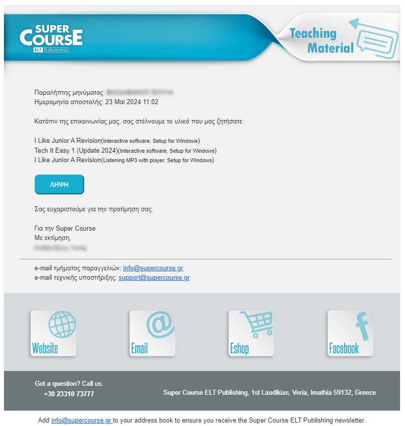 Στην επικοινωνία σας με της Super Course, ζητήσατε να σας αποσταλούν κάποια από τα συνοδευτικά Software των βιβλίων και λάβατε ένα e-mail παρόμοιο με το παρακάτω.