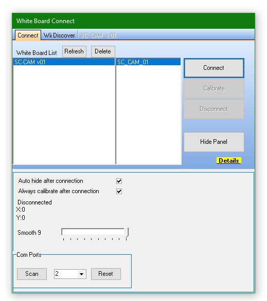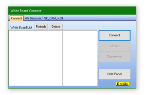 Τέλος πρέπει να γίνει calibration της κάμερας διάδρασης με την προβολή του βιντεοπροβολέα. Πατήστε το button calibrate όπως φαίνεται στην παραπάνω εικόνα και θα εμφανιστεί λευκή οθόνη και διαδοχικά τέσσερις “σταυροί ” σε κάθε γωνία. Κρατήστε το πενάκι πάνω σε κάθε σταυρό χωριστά μέχρι να εμφανιστεί το check και αφού γίνουν check και οι τέσσερις σταυροί έχει ολοκληρωθεί το calibration.